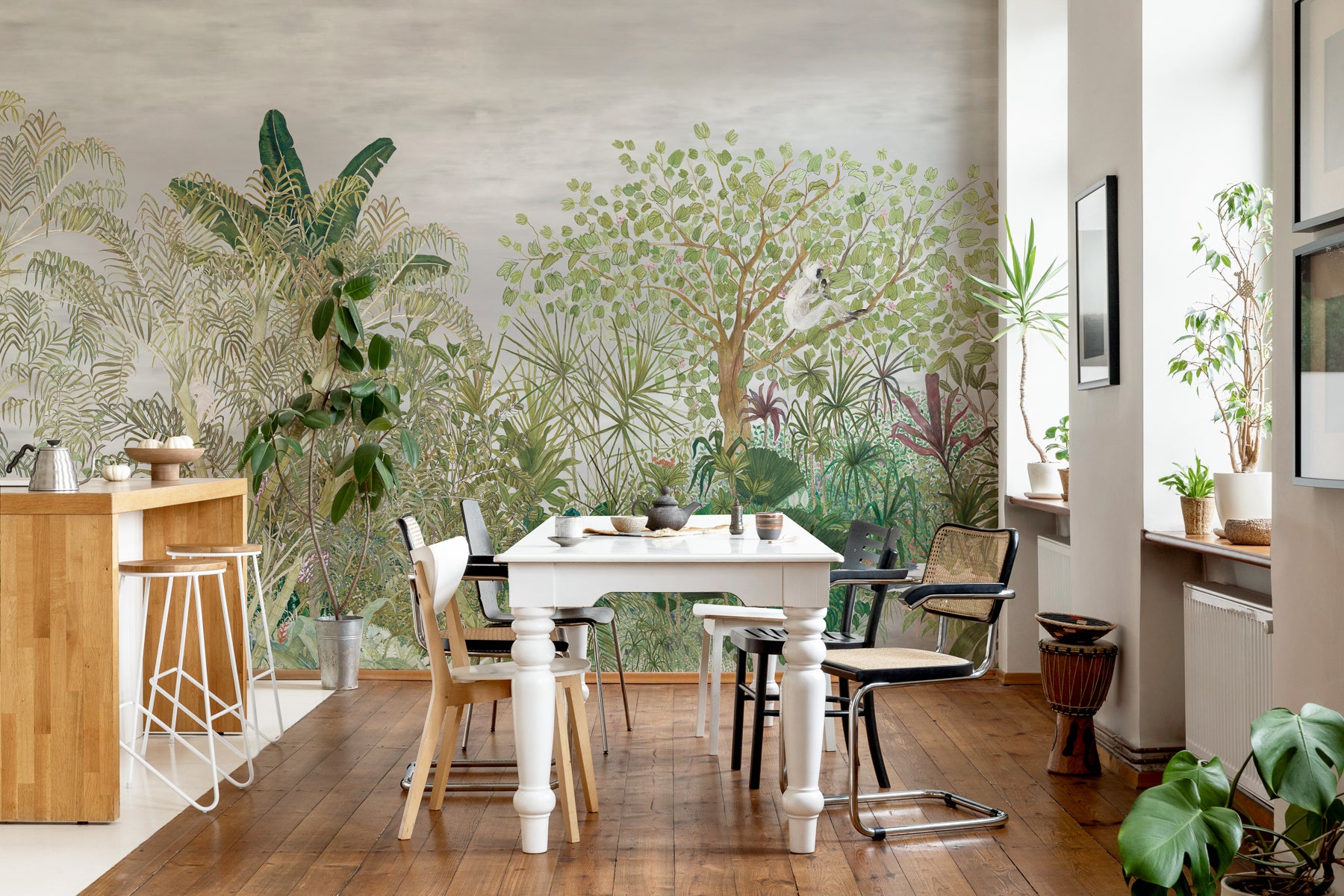 The Painted Forest collection of wallpapers draws from a lush, tropical landscape of plants such as palms and plantains, and trees such as the frangipani, kachnar and jackfruit. Arranged as a panorama, the main artwork features a garden in almost full scale, and spans over 90 feet as a non repeating design. The artwork is entirely hand drawn and coloured using mixed media such as water colours, gouache and pencil.