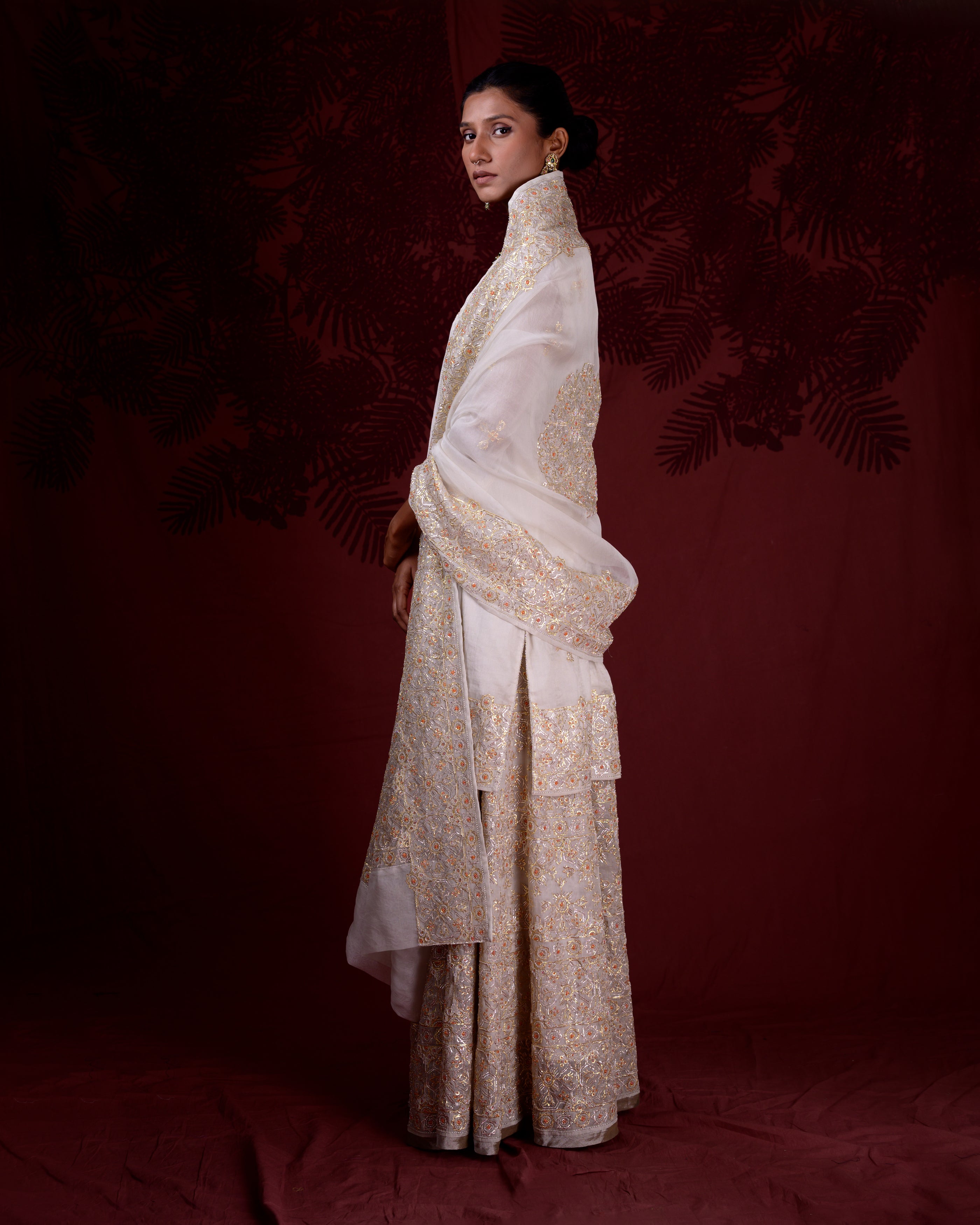 Lakshmi, our collection of festive Indian outfits and bespoke bridal wear, is named after the Indian goddess of wealth and beauty. It features rich traditional embroideries such as Zardosi, Ari, and Gota that use gold, silver, and threadwork with other materials such as sequins and beads.