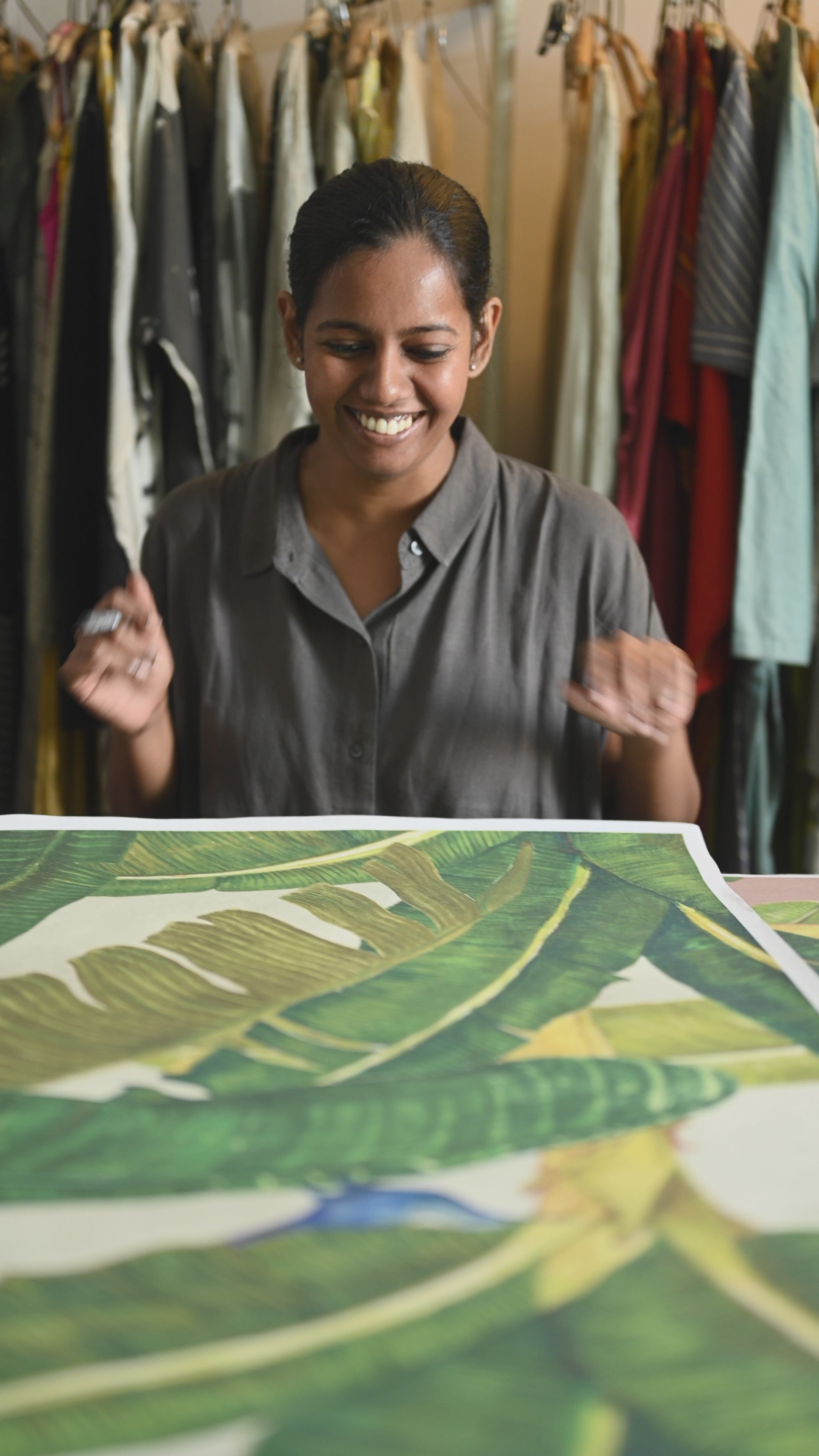 Artist Jisha Unnikrishnan’s inspiration for the collection came from the garden at Amethyst, Chennai. Part real and part fantasy, and drawn in a naturalistic style, birds and animals disappear into the foliage set against a gentle monsoon sky, while a dense growth of shrubs and grasses form the base of the composition. The panorama serves as the inspiration for all the designs in this collection. References are varied and include the magnificent dreamscapes of Henri Rousseau, colours from Indian popular art, wood block printing and French Toile de Jouy textiles.