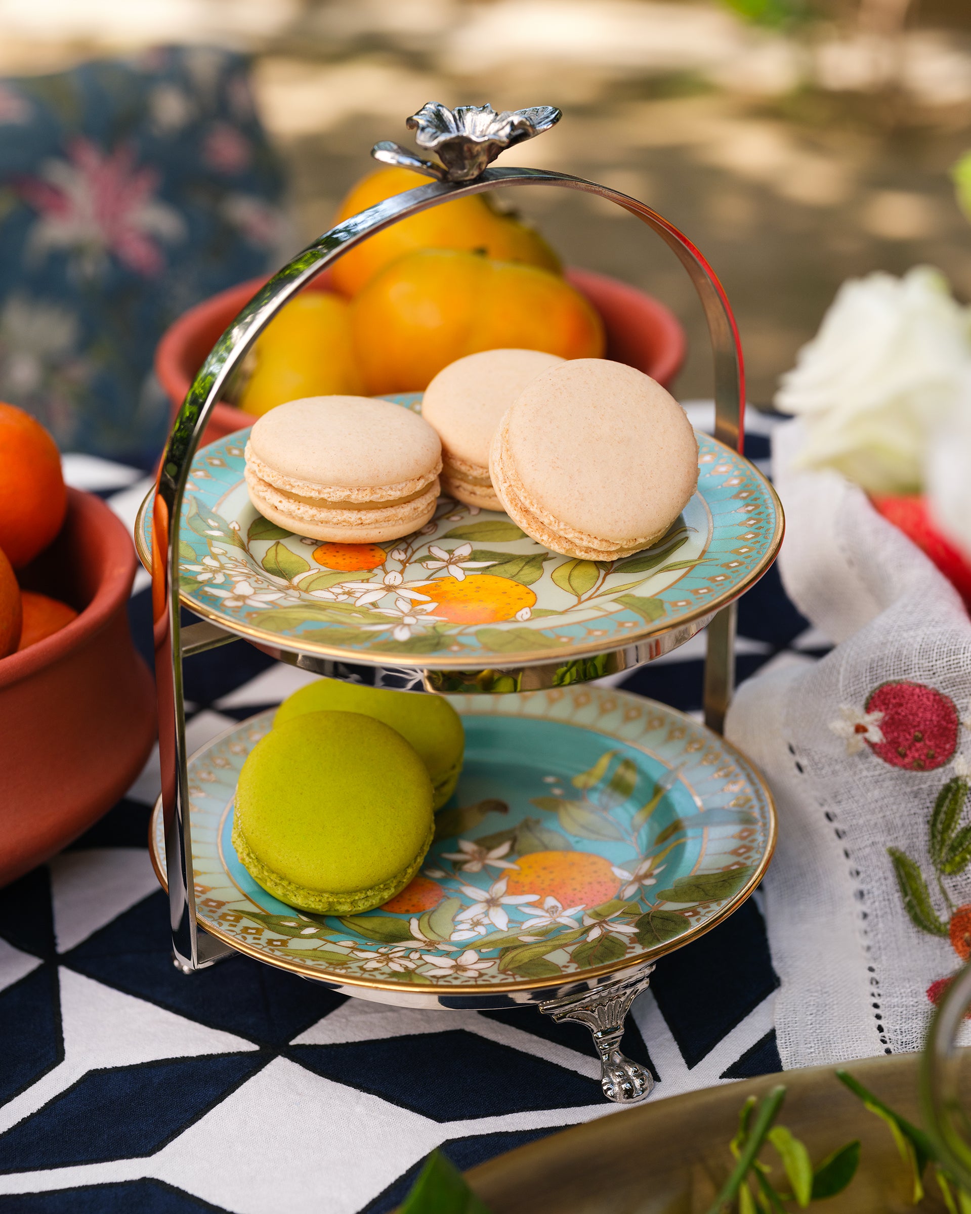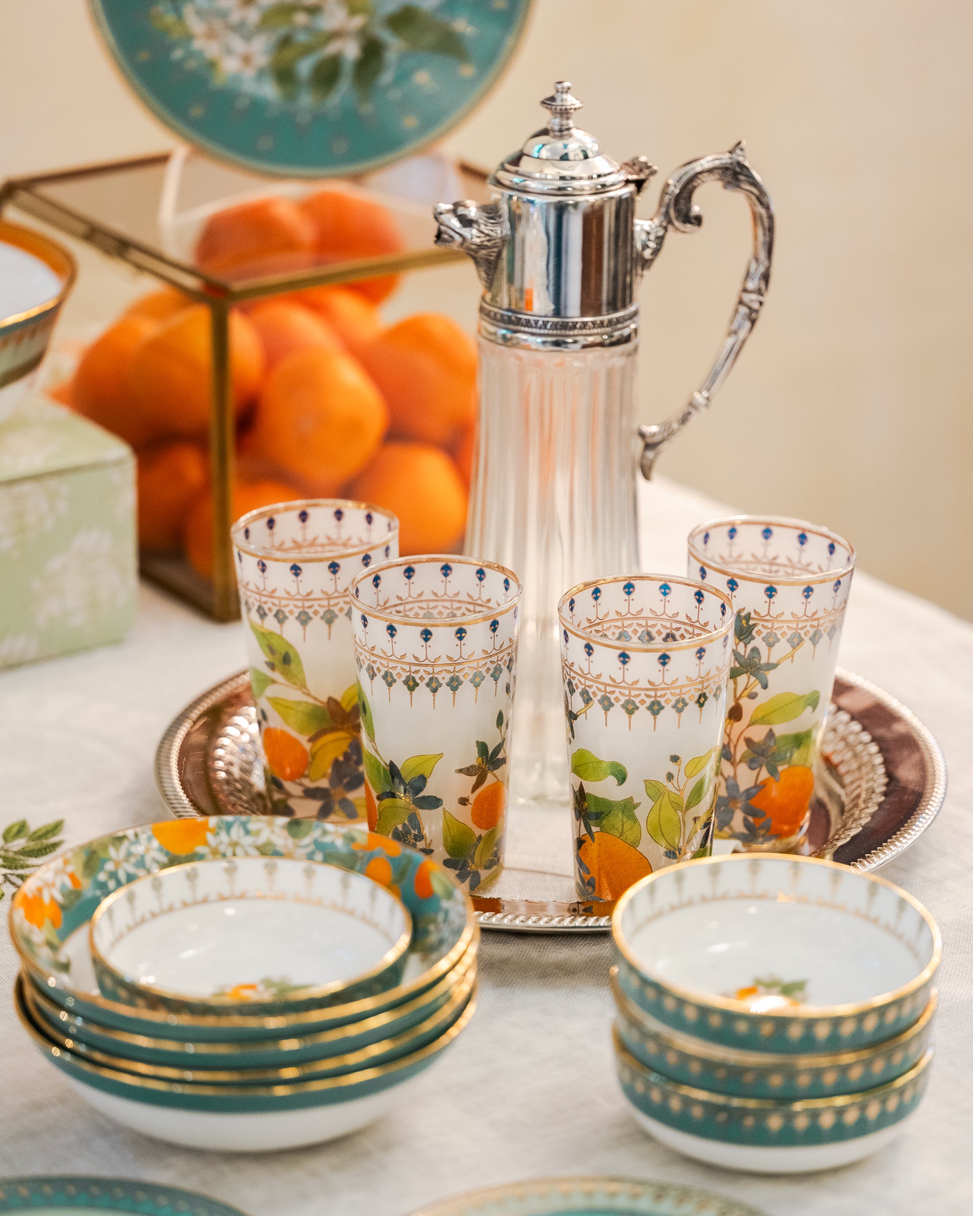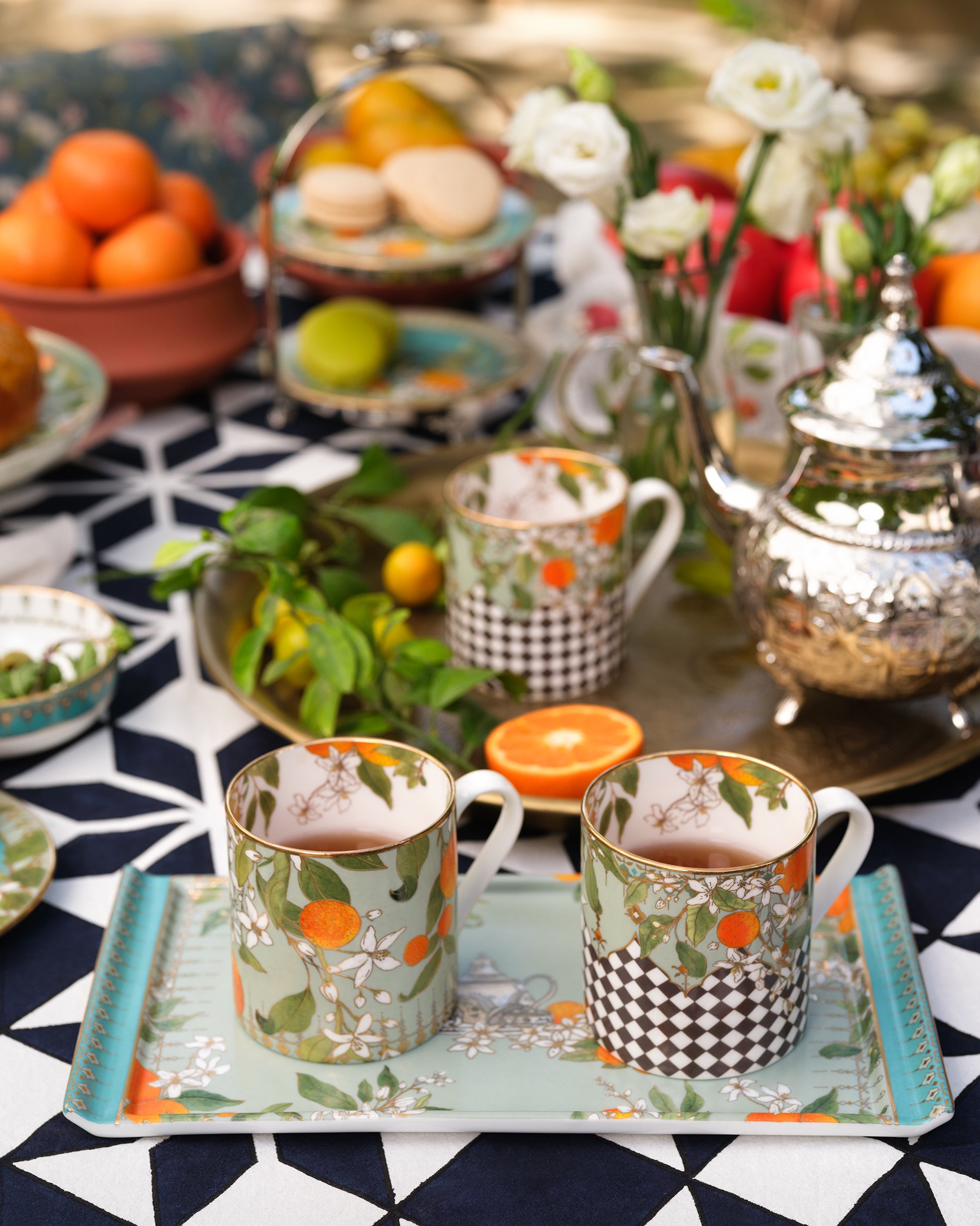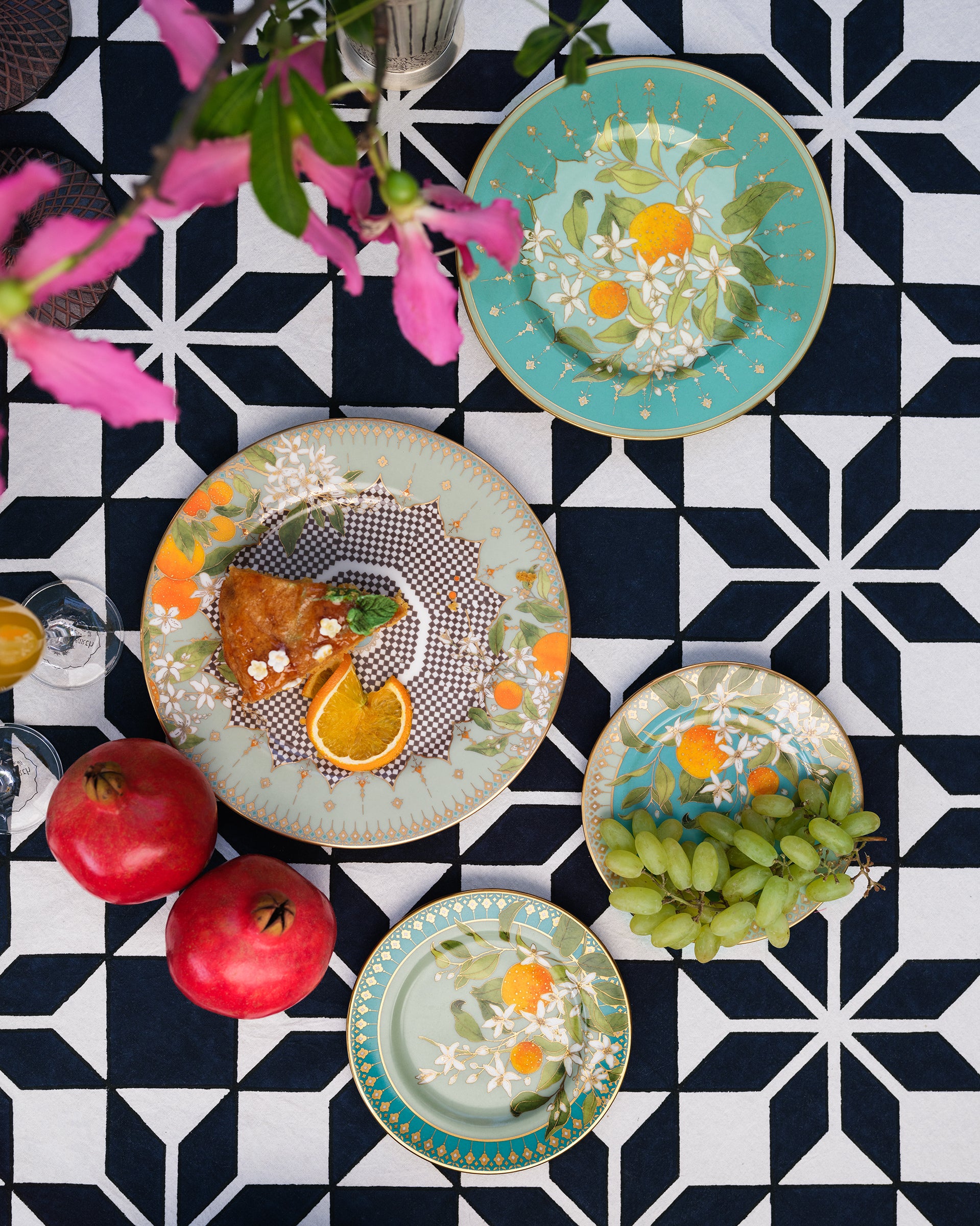 Tangerine is an homage to the beauty of orange blossoms and fruit, found in abundance and culturally significant to Morocco and the Mediterranean region of Europe. Created in collaboration with Indian luxury brand Good Earth, this is our first foray into tableware design. Watercolour illustrations by Jisha Unnikrishnan which were inspired by the region’s courtyards and decorative arts are translated onto fine china, embellished with 24 carat gold.