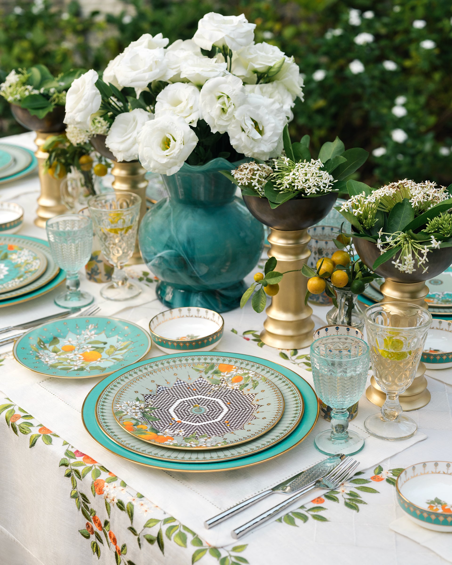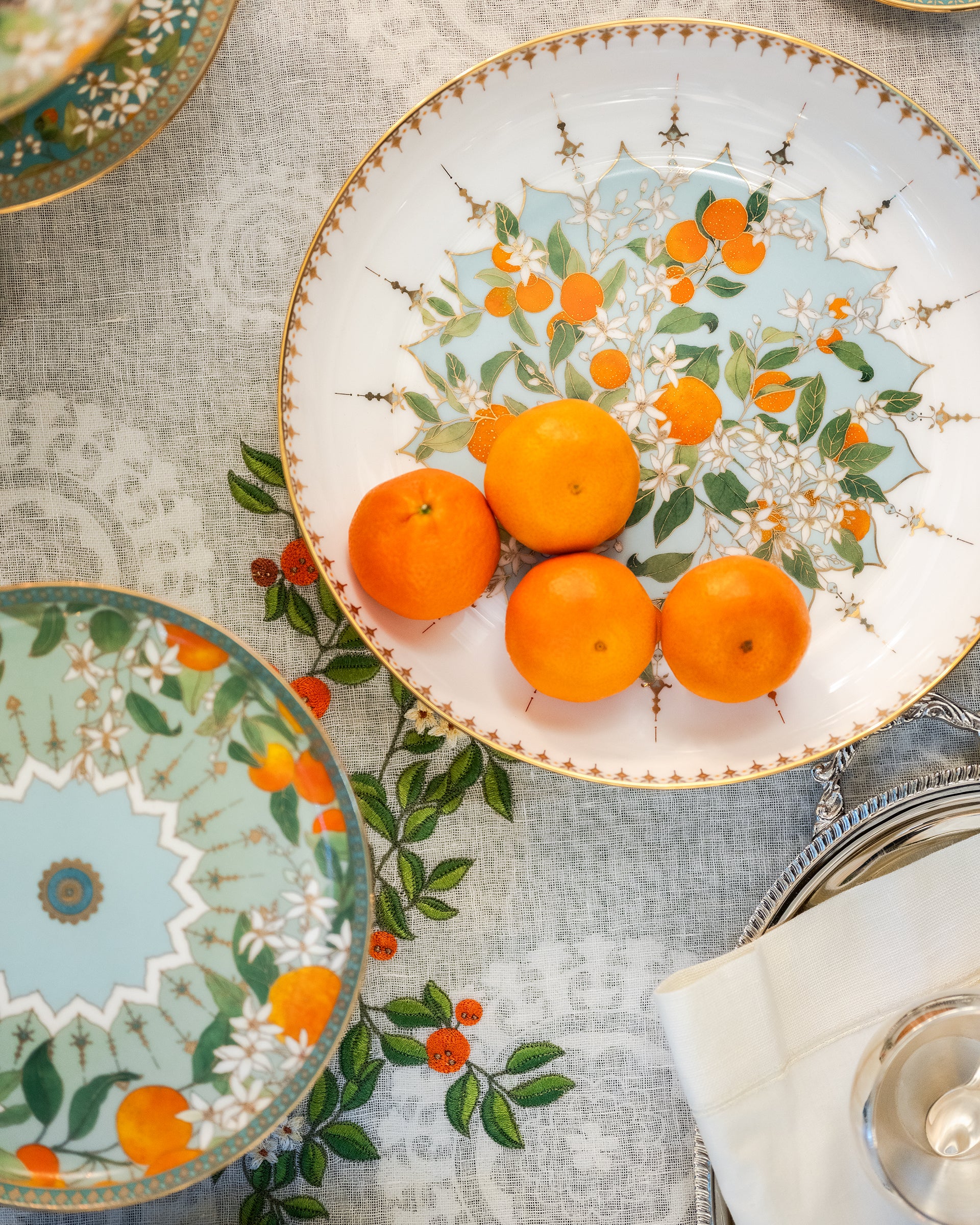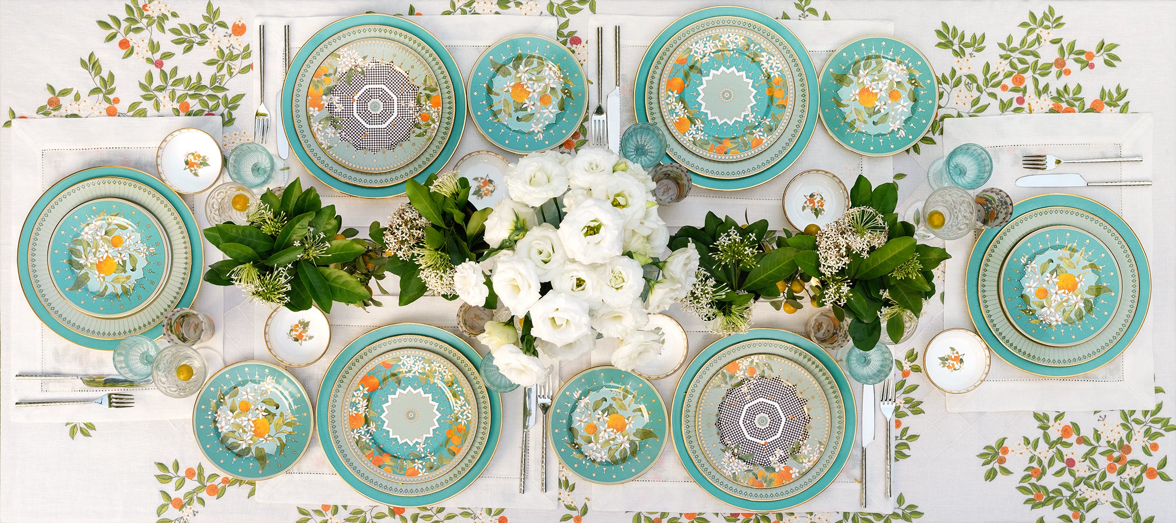 The collection features several patterned plates and bowls that can be layered in different combinations in a palette of turquoise and sage, recalling the sunshine and colours of the seaport of Tangier. Coordinating table cloths and napkins featuring embroidered sprigs of Tangerine fruit and blossom complete the offering and add to the layered experience.
