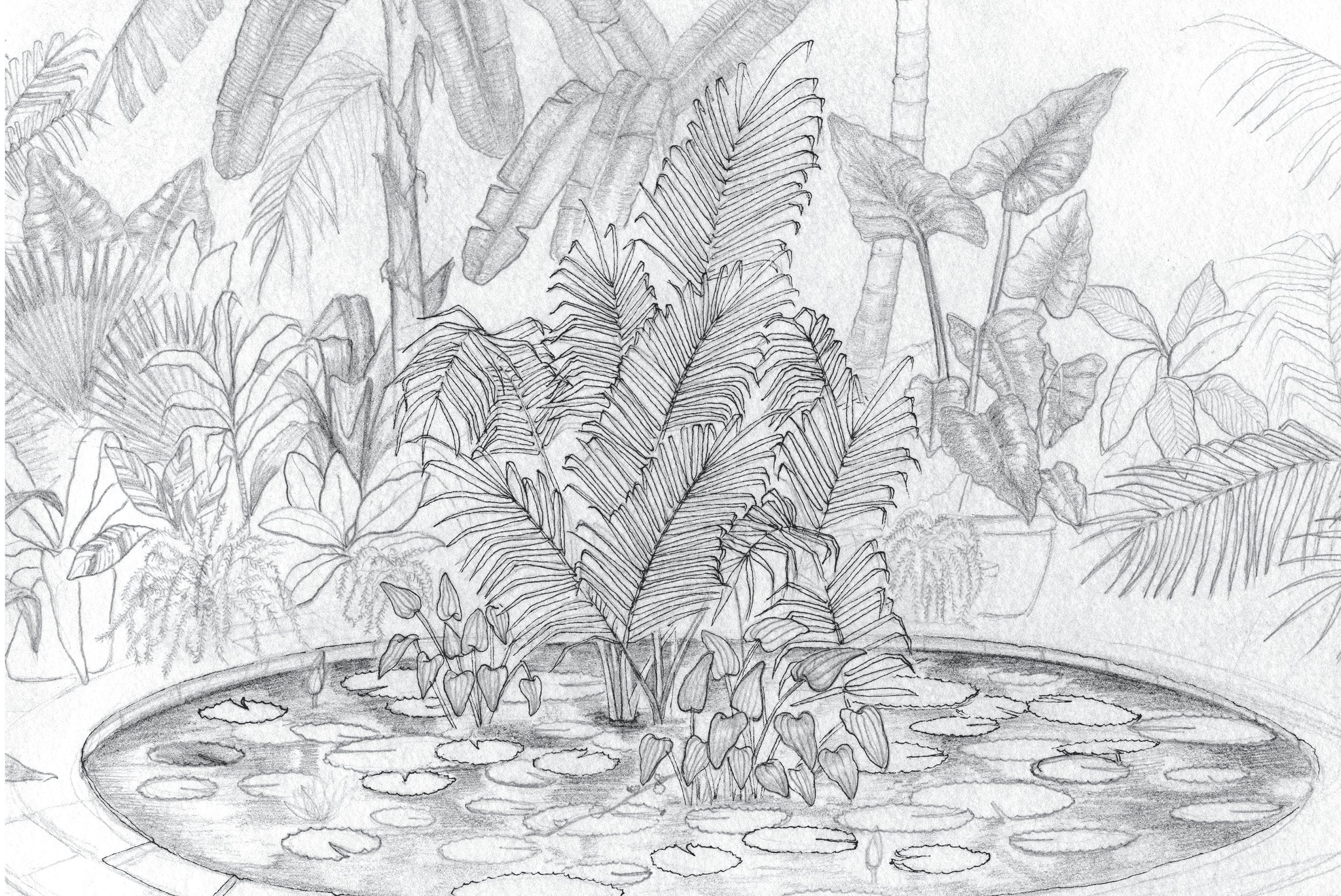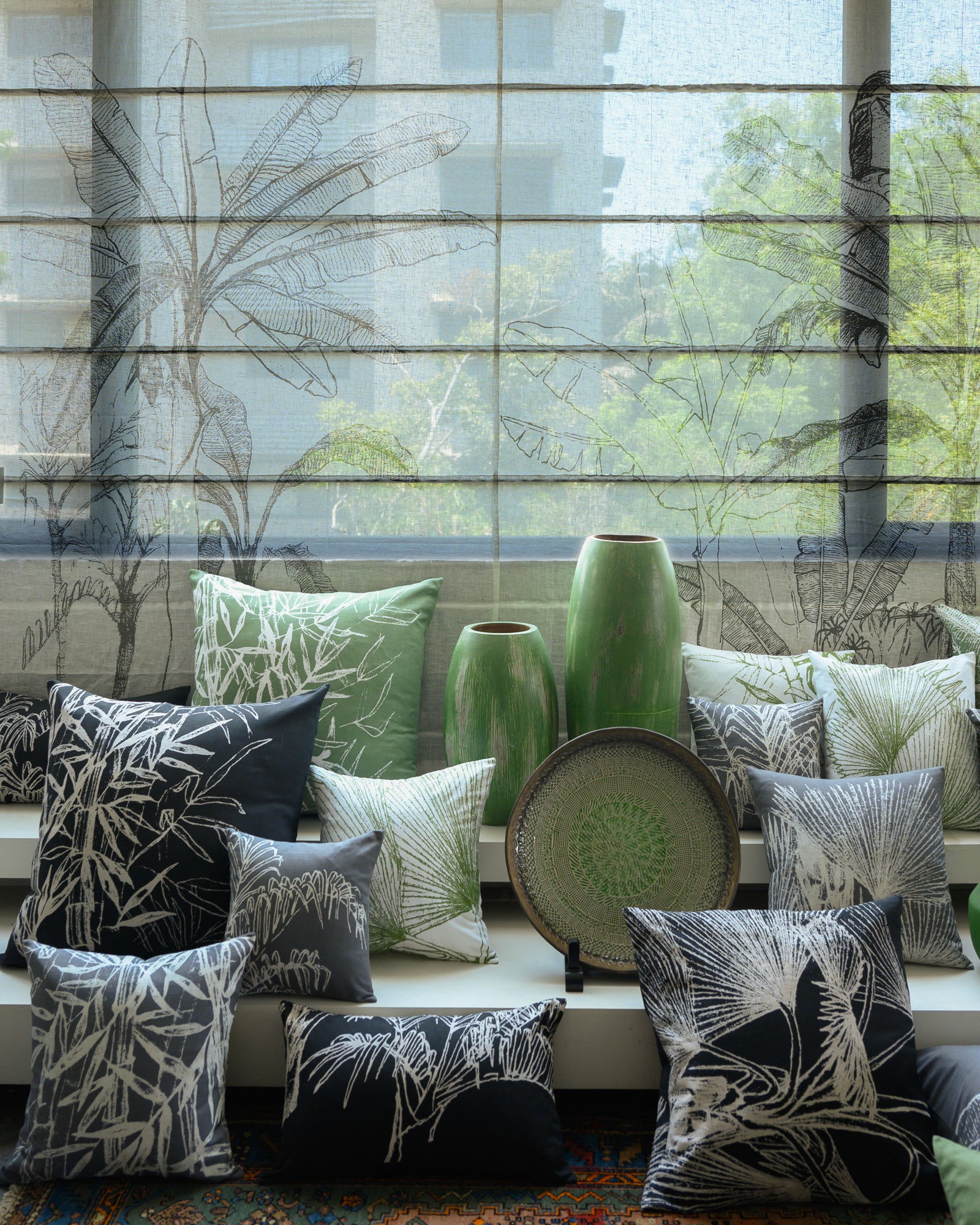 Created initially for the Wild Garden Café, Amethyst in the heart of Chennai, designer/illustrator Jisha Unnikrishnan's charcoal and pen & ink botanical drawings were composed into a non-repeating 120 ft panorama without any repeating sections. The inspiration for the panorama came from French painter Henri Rousseau's dream-like pictures and Amethyst’s own tropical garden.